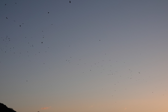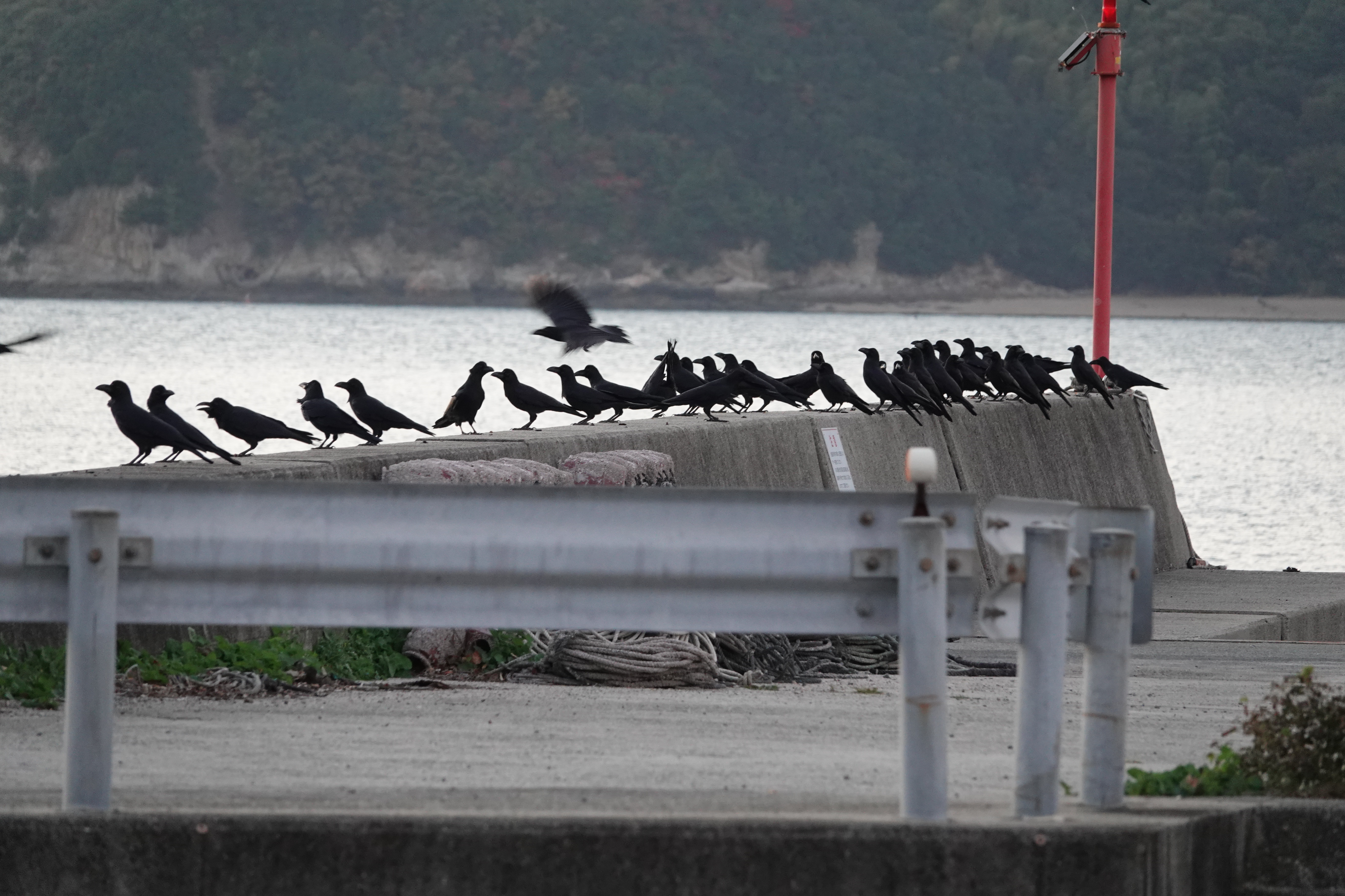 鯨漁港の離岸堤に日没時に集結しねぐらいりするハシボソガラスの数の多さに思わずシャッターを切りました。 中に何羽ですがハシボソガラスも混ざっていました。 ヒヨ爺